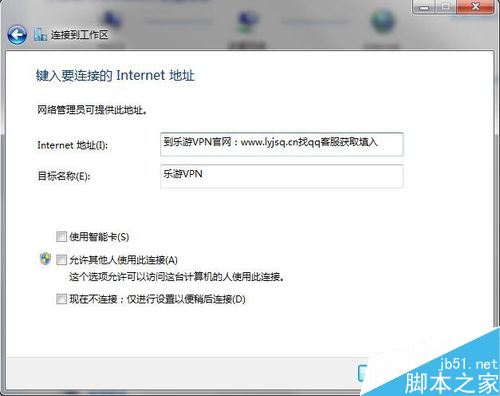 然后使用我的internet网络连接,输入目标地址和账号密码点连接
